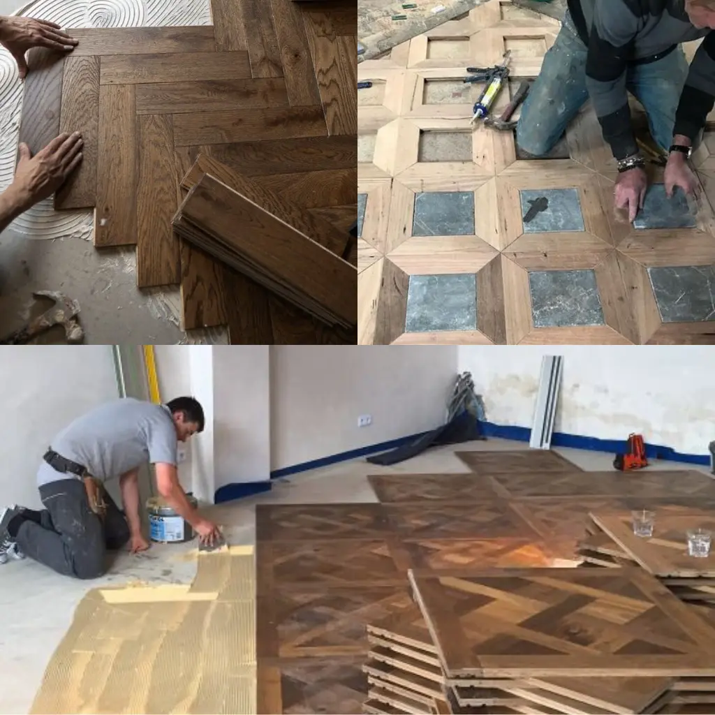 After preparing the subfloor, we begin installing the parquet floor. The flooring planks are arranged in a pattern of your choice for your desired aesthetic appeal.